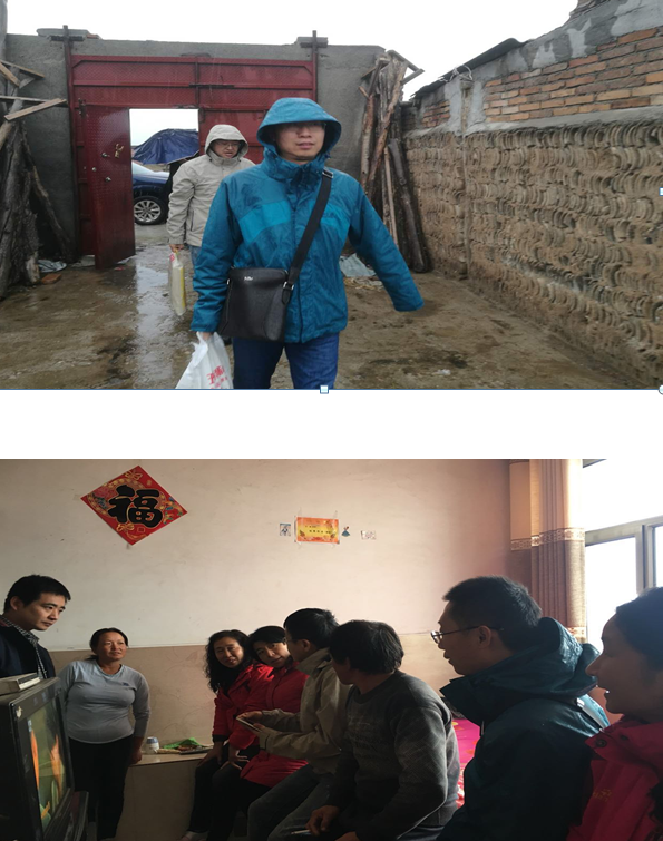 在我校派驻五寨县东秀庄乡扶贫工作队队长李斌副乡长、高梅副书记的陪同下,人文社会科学学院一行冒雨分别走进贫困户王海如和王海军家里进行看望并送上了米面油等慰问品。院领导与贫困户进行了亲切交谈,了解他们目前的生活状况、经济收入状况、子女教育情况,倾听他们的心声和切实需求,询问他们存在的最大困难,鼓励他们坚定信心,把握机遇,充分利用国家的扶持生产精准扶贫战略,争取早日脱贫。